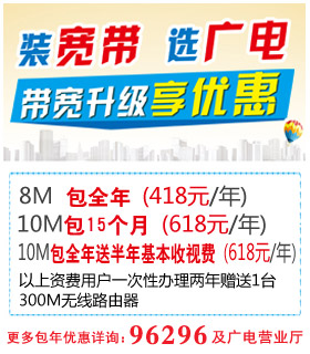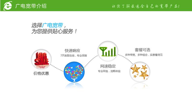 廣電寬帶-- 以速度和內(nèi)容取勝。帶寬持續(xù)升級(jí),步入百兆光速時(shí)代,以豐富多彩的內(nèi)容,全力為用戶奉獻(xiàn)網(wǎng)絡(luò)高速優(yōu)質(zhì)、價(jià)格實(shí)惠的家庭寬帶服務(wù)產(chǎn)品。