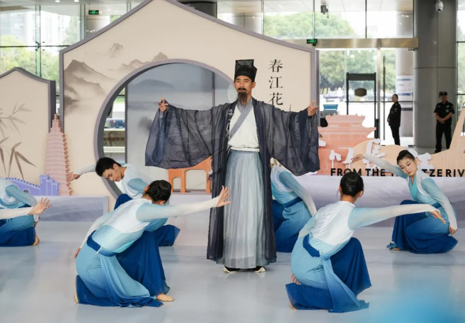 “大江東去,浪淘盡,千古風(fēng)流人物?!眴觾x式上,舞者們通過翩然的舞姿展現(xiàn)長江之磅礴氣勢與鱗波。“江河奔騰,文脈恒長”,隨著北宋文學(xué)家“蘇軾”形象的入場,嘉賓們跟隨著“蘇軾”的視角,一步入境,一同步入這場數(shù)字漂流,在流動的數(shù)字景觀中感知母親河的生命脈動,體悟“我與長江”的時代共振。