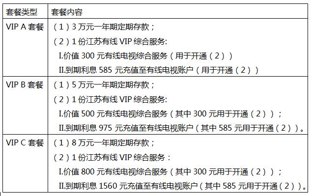 辦理“有線寶”VIP套餐的客戶,自愿同意將到期的1.95%儲蓄利息和“有線電視綜合服務(wù)”均充入同一有線電視用戶賬戶,則江蘇有線將按照885元/年的優(yōu)惠價(jià)格為該賬戶開通“江蘇有線VIP綜合服務(wù)”一年。