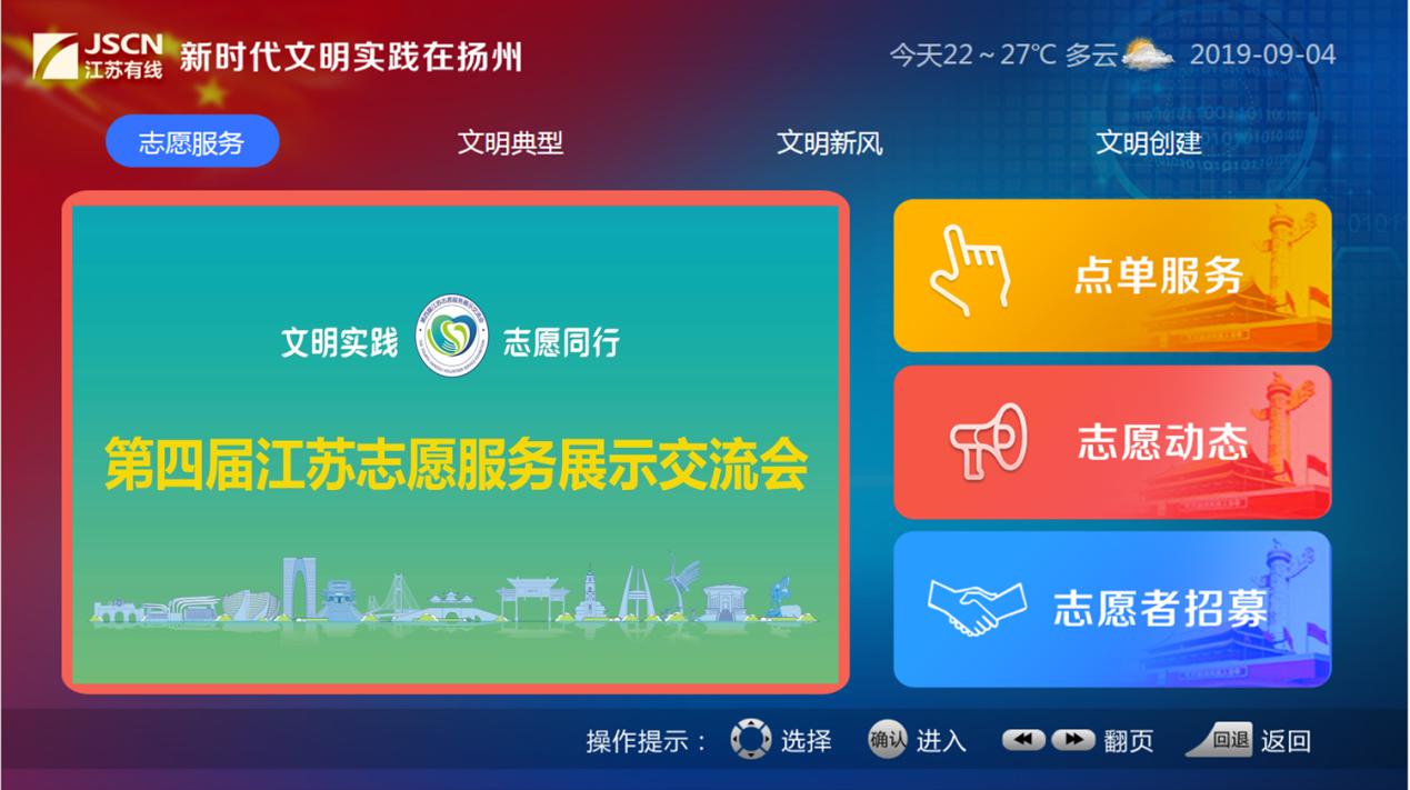 在揚(yáng)州舉行的第四屆江蘇志愿服務(wù)展示交流會(huì)上,由揚(yáng)州市委宣傳部(文明辦)與江蘇有線揚(yáng)州分公司聯(lián)合打造的“新時(shí)代文明實(shí)踐在揚(yáng)州”電視互動(dòng)平臺(tái)亮相志交會(huì)揚(yáng)州館。